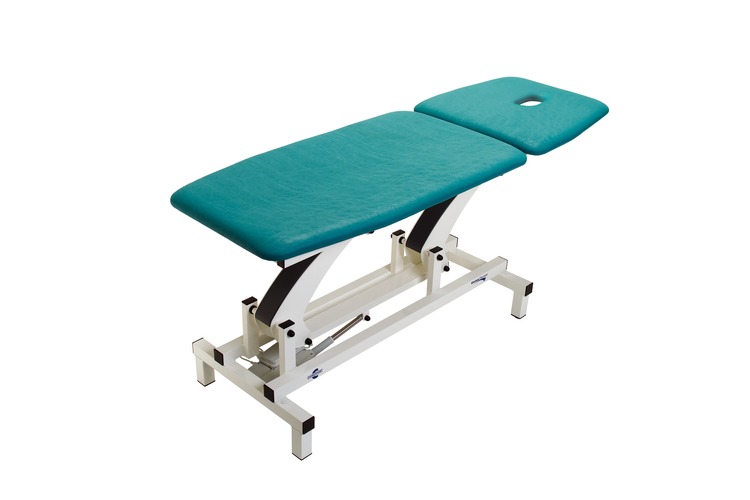 Bàn trị liệu 2 khúc, phần đầu điều chỉnh bằng pít-tông, chiều cao nâng hạ bằng điện hoặc thủy lực.