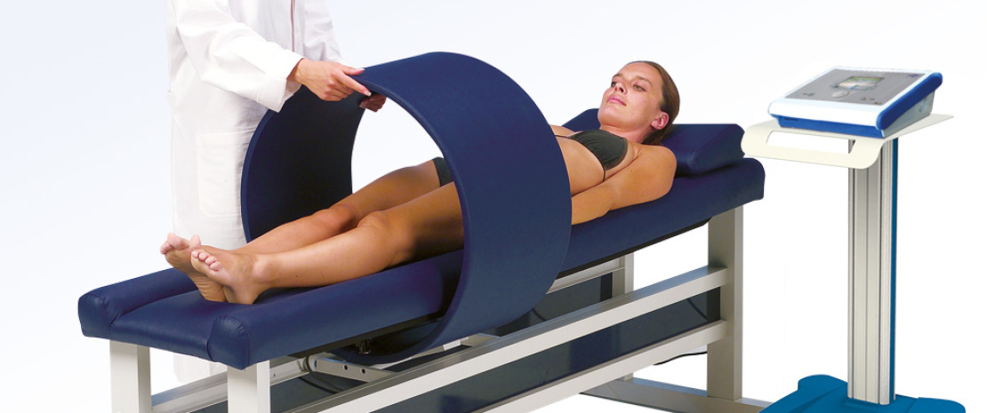 Giường điều trị đi kèm với đệm đầu và cuộn từ Ø60 cm hỗ trợ trị liệu toàn thân tiện lợi